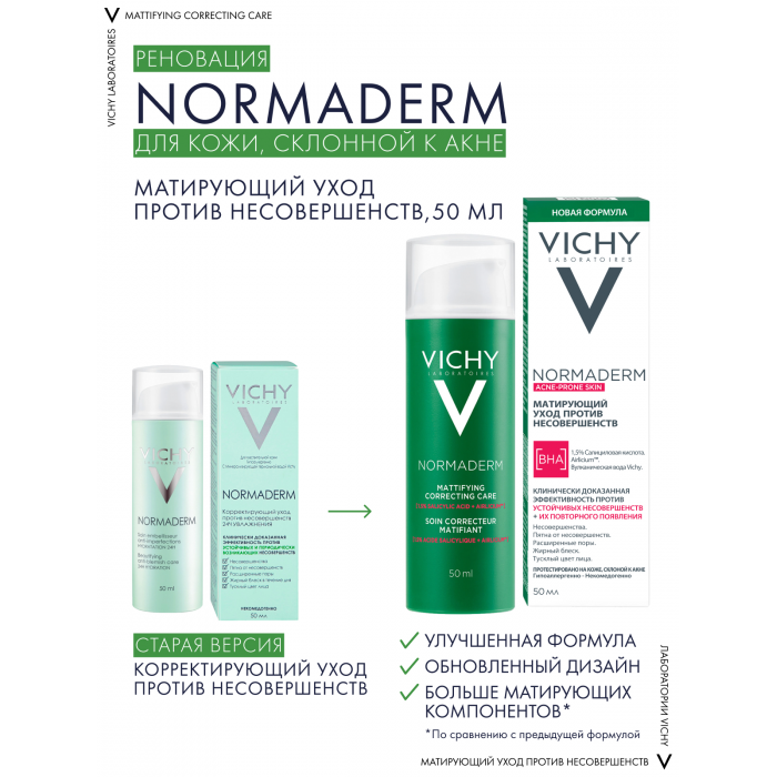 8 из 10 женщин сталкиваются с проблемой акне даже после подросткового возраста. Воспаления имеют другой механизм возникновения: они четко зависимы от менструального цикла и стрессов, особенно хронических, становятся более устойчивыми и сложнее поддаются коррекции. Лаборатории VICHY впервые объединили 4 активных дерматологических компонента для увлажнения и восстановления кожи с несовершенствами в новом уходе NORMADERM: [Салициловая кислота 1,5% + LHA] корректируют устойчивые и периодически возникающие несовершенства, PhE-Resorcinol способствует усилению процессов регенерации в эпидермисе и борется со следами несовершенств, AirLicium нейтрализует жирный и влажный блеск в течение дня.