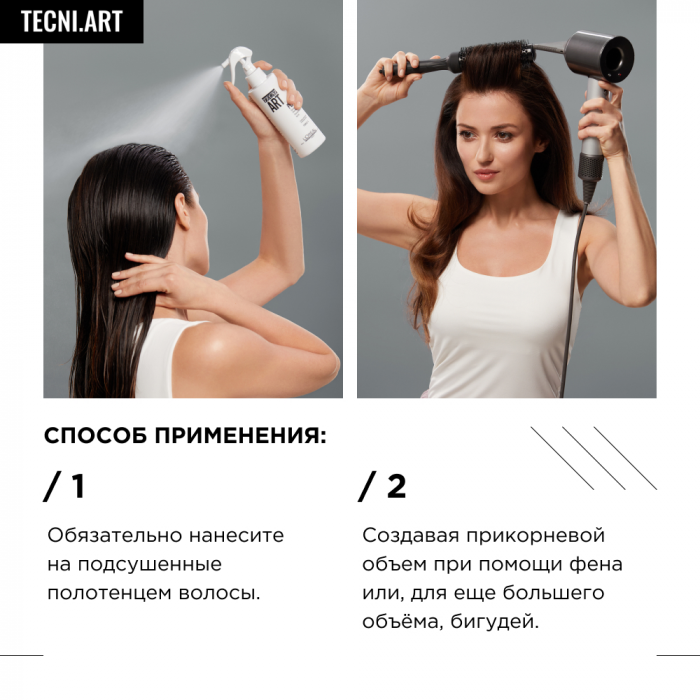 Нанесите на высушенные полотенцем волосы, создавая прикорневой объем при помощи фена.