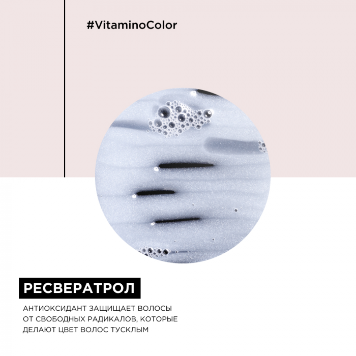 Стойкость и насыщенность цвета после окрашивания во многом зависит от правильно подобранного ухода. Шампунь Vitamino Color мягко очищает окрашенные волосы и предотвращает вымывание и тусклость цвета. Не пересушивает и не утяжеляет пряди, защищая волокно волоса от внешних повреждений. Ресвератрол - натуральный антиоксидант из ягод винограда, защищает пигмент от вымывания. Результат — стойкий цвет до 8 недель после окрашивания. Теперь упаковка всех средств Serie Expert на 100% состоит из перерабатываемого пластика, за исключением крышки и этикетки. L’Oreal Professionnel уже 110 лет заботится о красоте женских волос: созданный в Париже, бренд является воплощением французской элегантности.