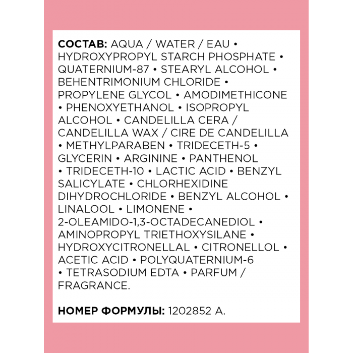 1202852 A - INGREDIENTS: AQUA / WATER / EAU • HYDROXYPROPYL STARCH PHOSPHATE • QUATERNIUM-87 • STEARYL ALCOHOL • BEHENTRIMONIUM CHLORIDE • PROPYLENE GLYCOL • AMODIMETHICONE • PHENOXYETHANOL • ISOPROPYL ALCOHOL • CANDELILLA CERA / CANDELILLA WAX / CIRE DE CANDELILLA • METHYLPARABEN • TRIDECETH-5 • GLYCERIN • ARGININE • PANTHENOL • TRIDECETH-10 • LACTIC ACID • BENZYL SALICYLATE • CHLORHEXIDINE DIHYDROCHLORIDE • BENZYL ALCOHOL • LINALOOL • LIMONENE • 2-OLEAMIDO-1,3-OCTADECANEDIOL • AMINOPROPYL TRIETHOXYSILANE • HYDROXYCITRONELLAL • CITRONELLOL • ACETIC ACID • POLYQUATERNIUM-6 • TETRASODIUM EDTA • PARFUM / FRAGRANCE. C241154/2.