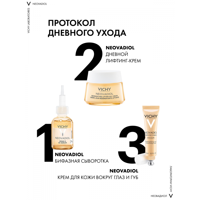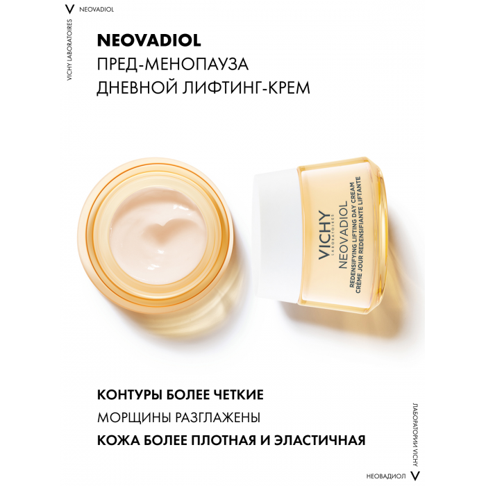 Инновация* от VICHY: Лаборатория VICHY разработала лифтинг-крем, соединяющий активные ингредиенты – вулканическую воду VICHY, обогащенную 15 минералами, проксилан, экстракт Кассии и гиалуроновую кислоту натурального происхождения. Крем компенсирует видимые признаки менопаузы на коже и обладает целенаправленным действием на восстановление плотности, сокращение морщин и повышение четкости контуров лица.