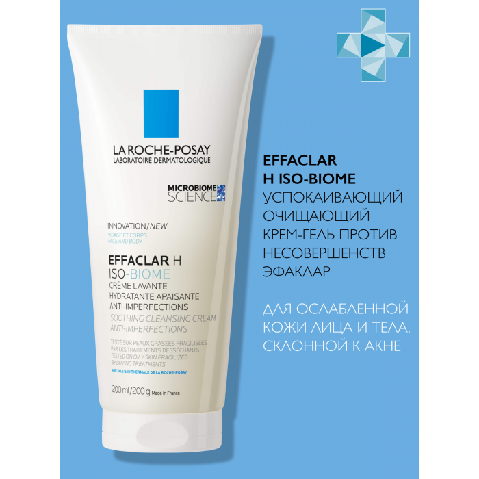 Кожа, склонная к появлению жирного блеска и несовершенств нуждается в увлажнении и защите не меньше, чем кожа любого другого типа. Использование средств для борьбы с акне может приводить к нарушению естественного защитного барьера кожи, ощущению сухости и дискомфорта. Успокаивающий очищающий крем-гель против несовершенств Effaclar H Iso-Biome не только бережно удаляет загрязнения с кожи, возвращая ощущение комфорта, но и борется с несовершенствами. Средство подходит для проблемной кожи лица и тела, ослабленной в результате использования пересушивающих средств для борьбы с акне.