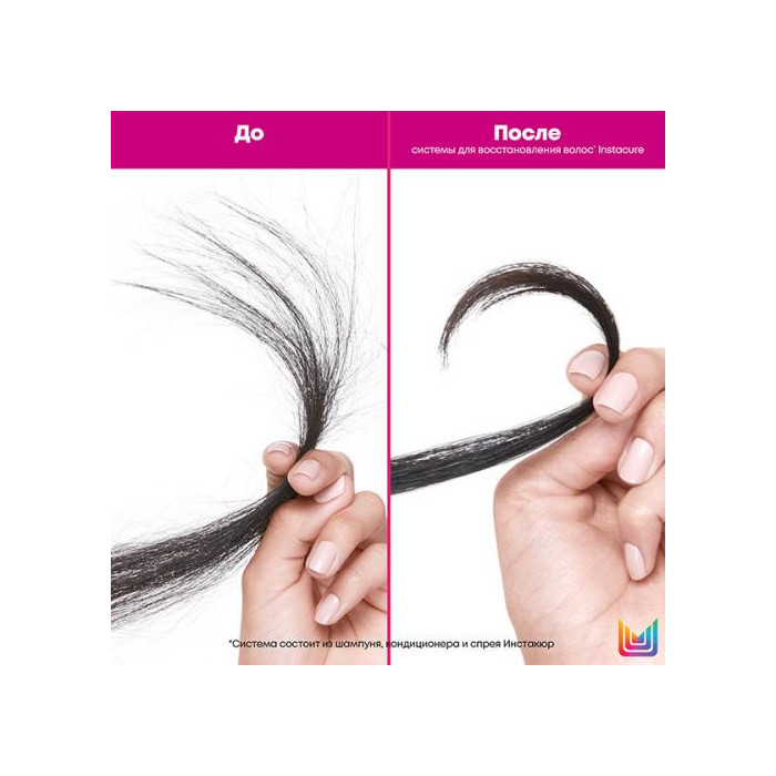 После шампуня Instacure нанести кондиционер, смыть водой. Далее нанести спрей Instacure, который заполняет пористую структуру волоса.