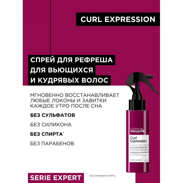 Профессиональный ухаживающий спрей для рефреша на каждый день Curl Expression для всех типов кудрявых волос. Формула обогащена 3% глицерина, Urea H и экстрактом семян гибискуса. Освежает и восстанавливает упругость кудрей. Мгновенная свежесть кудрей, упругий завитой и дисциплина. В 6 раз больше очерченности*. Антифриз эффект в течение 48 часов*. Без сульфатов, без силикона, без спирта, без парабенов. *Инструментальный тест