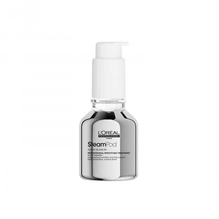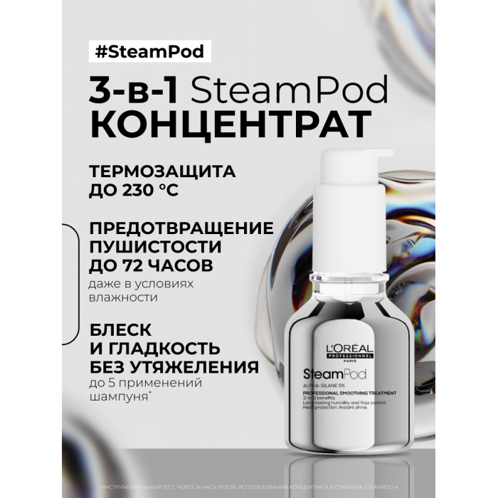 L'Oréal Professionnel представляет новый концентрат SteamPod для защиты волос от высоких температур и экстримально высокой влажности. Запатентованная формула содержит 5% альфа-силана — активного гидрофобного ухаживающего компонента, который впервые входит в состав ухаживающих продуктов за волосами Альфа-силан, активируется и усливается под воздействием тепла,создает защитный слой вокруг волоса, который сохраняется до 5 применения шампуня*. Концентрат SteamPod совместим со всеми видами щипцов и выпрямителей. Термозащита до 230°C (450°F)*. Термозаища в сочетании со стайлреами – MUST HAVE.. Волосы остаются увлажненными, мягкими и до 99% более послушными*, а укладка занимает в 3 раза меньше времени**. Волосы при выпрямлении меньше повреждаются за счет мягкости и питания до 5 применений шампуня*. Волосы надежно защищены от 80% влажности* воздуха, а также мгновенно становятся блестящими, гладкими и послушными. Продукт предназначен для нанесения на волосы, подсушенные полотенцем, непосредственно перед использованием фена и инструмента для термоукладки. Концентрат SteamPod можно использовать с любыми выпрямителями, но наилучших результатов можно добиться именно в сочетании со SteamPod 4 от L'Oréal Professionnel. Этот универсальный профессиональный стайлер сочетает в себе уникальную паровую технологию, обеспечивающую непрерывный поток сухого пара, подаваемый специальным насосом, в объеме 0,8 г в минуту — оптимальный показатель для достижения наилучших результатов укладки. Ломкость волос снижается до 95% для волнистых волос и до 91% для волос этнического типа***. Изысканная парфюмерная композиция раскрывает роскошный цветочный аромат с нотами бергамота, цветка апельсина и пачули. Это инновация иллюстрируется как футуристическая и изысканная визуальная материя, подчеркивающая жидкую и прозрачную текстуру разглаживающего ухода, что полностью соответствует виденью бренда вдохновленной технологиями