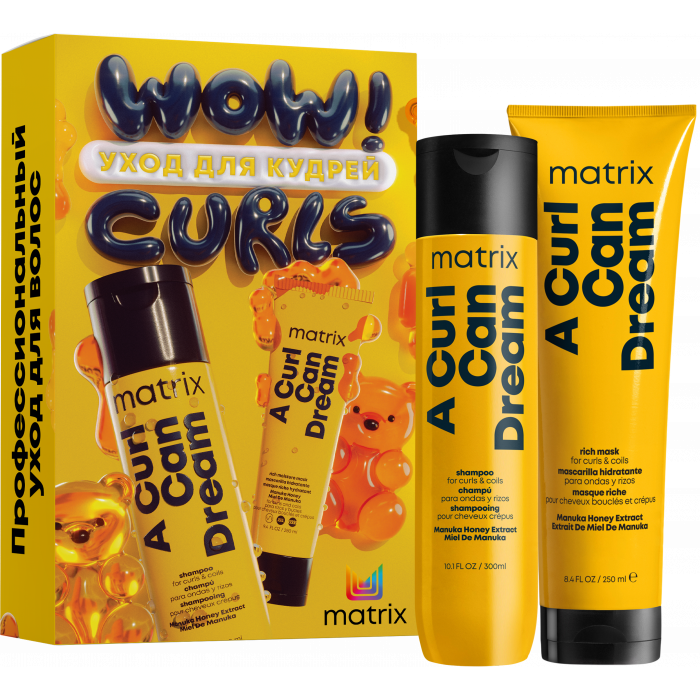 Maximize Профессиональный шампунь A Curl Can Dream для кудрявых и вьющихся и волос интенсивно очищает, удаляет с волос накопившийся стайлинг, помогает "расклеить" пряди после укладки кудрявым методом. Увлажняющая маска этой серии благодаря формуле с экстрактом меда Манука глубоко увлажняет и питает кудри изнутри, уменьшает пористость, делает кудри мягкими, блестящими и послушными. Формула запечатывает влагу, необходимую для поддержания упругого завика кудрявых волос, изнутри, не утяжеляя его. Все, что нужно кудрявым волосам для создания красивого, очерченного и упругого завитка, теперь в гамме A Curl Can Dream. Аромат гаммы раскрывается нотами розы, пиона и морской соли. Открой для себя профессиональные уходы от Matrix в лимитированной подарочной упаковке.