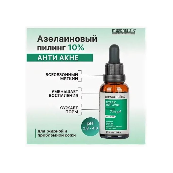 Пилинг с азелаиновой кислотой обеспечивает мягкую эксфолиацию, выравнивает рельеф, нормализует выработку кожного сала, способствует уменьшению воспалений и профилактике образования комедонов. Мягкий всесезонный кислотный пилинг для лица с азелаиновой кислотой, гликолевой кислотой, натуральной салициловой кислотой и ниацинамидом, домашний пилинг, содержит 10% кислот, не требует нейтрализации, без реабилитации и шелушения.