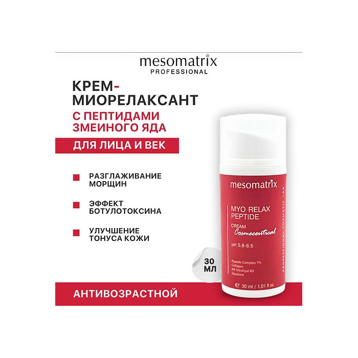 Maximize Пептидный комплекс 7% способствует уменьшению глубины мимических морщин, восстановлению трофики и формированию привычек гармоничной мимики. Крем обладает антивозрастным, питательным и лифтинг-эффектом. Нейропептиды действуют как мягкий неинвазивный аналог ботулотоксина, блокируют передачу импульса от нерва к мышечному волокну, что снижает спастические явления в зоне мышечных зажимов, особенно на лбу и в зоне вокруг глаз. Действие крема MYO RELAX PEPTIDE: Уменьшение глубины морщин; Расслабление мимических спазмов ("гусиные лапки", морщины на лбу, кисетные морщины и др.); Увлажнение поверхностных и глубоких слоев эпидермиса; Стимуляция активности фибробластов, что дает восстановление упругости и тонуса тканей; Восстановление водно-липидного барьера за счет восполнения незаменимых липидов; Улучшение текстуры и тона кожи; Восстановление защитных свойств эпидермиса; Область применения крема с эффектом ботулотоксина: Для всех типов кожи при возрастных изменениях, мимических морщинах. Для интенсивного ухода за возрастной кожей, от первых возрастных изменений 30-35+ до выраженных 55-65+; Подходит для тонкой чувствительной кожи с признаками купероза; Подходит для кожи с дерматозами вне обострения. Для лица и век, шеи и декольте. Для профессионального и домашнего применения. Всесезонное применение, не требует специальной SPF защиты.
