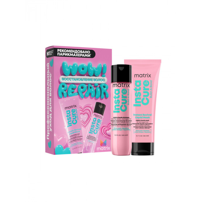 Maximize Встречай новую коллекцию подарочных наборов профессиональных уходов от Matrix для восстановления очень поврежденных волос. Профессиональный бессульфатный шампунь Instacure Build-A-Bond заботливо очищает и укрепляет волосы. Технология восстановления миллиарда связей внутри волос делает их в 8 раз* сильнее. А укрепляющая бондинг-маска моментально впитывается, восстанавливая волосы на всех уровнях: изнутри и снаружи. Внутри гаммы Build-A-Bond квалан. Открой для себя профессиональные уходы от Matrix в лимитированной подарочной упаковке.