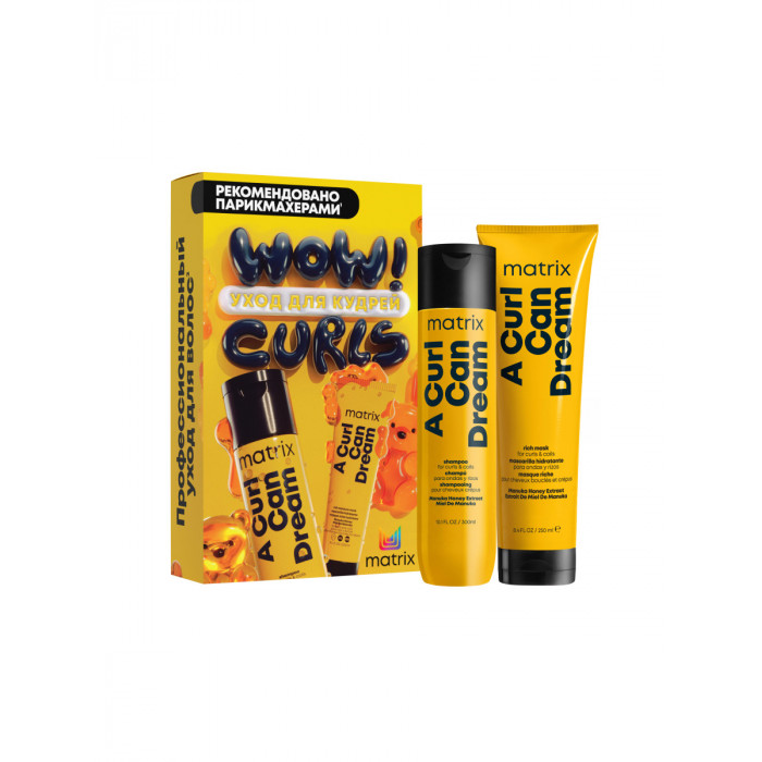 Maximize Встречай новую коллекцию подарочных наборов профессиональных уходов от Matrix для ухода при кудрявом методе! Профессиональный шампунь A Curl Can Dream для кудрявых и вьющихся и волос интенсивно очищает, удаляет с волос накопившийся стайлинг, помогает "расклеить" пряди после укладки кудрявым методом. Увлажняющая маска этой серии благодаря формуле с экстрактом меда Манука глубоко увлажняет и питает кудри изнутри, уменьшает пористость, делает кудри мягкими, блестящими и послушными.