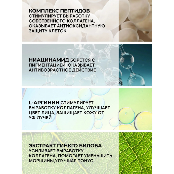 Сыворотка для лица обеспечивает глубокое увлажнение за счёт комплекса активных компонентов, таких как L-аргинин, комплекс аминокислот, аспарагиновая кислота, экстракт гинкго билоба, ниацинамид, комплекс пептидов.